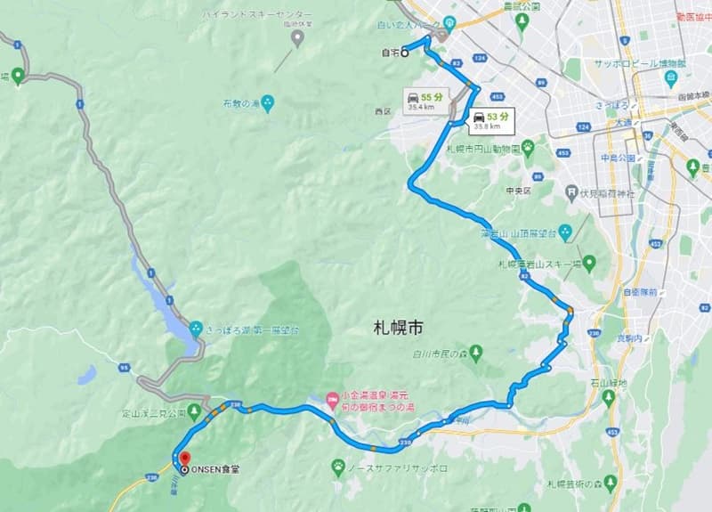 札幌駅から豊平峡温泉行のバスが出ていて、交通機関で直接アクセスすることも可能