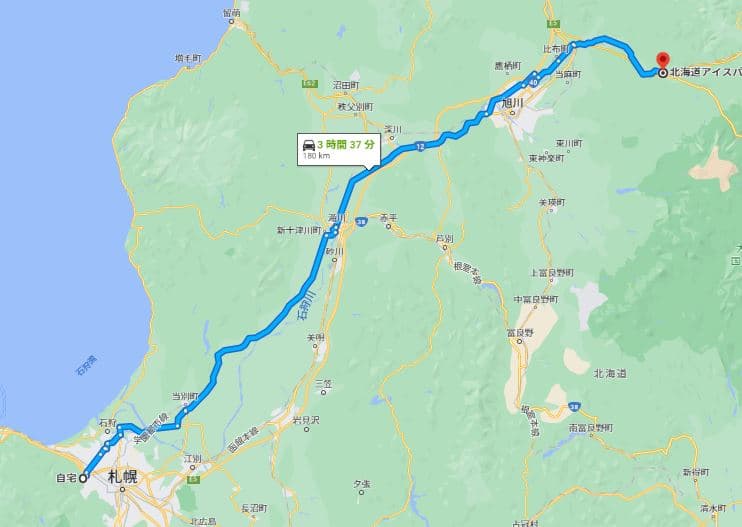 まず、アイスパビリオンは北海道の上川町にあって、札幌から車でいく場合は、高速で約2時間30分、下道で約3時間40分かかる