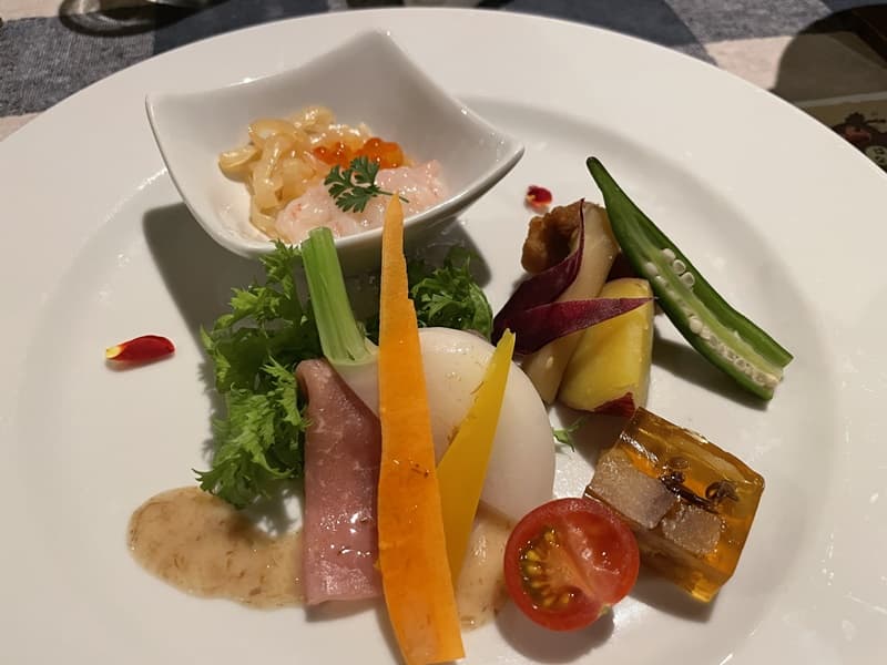前菜はお野菜や生ハム、煮凝りなどがプレートで来る