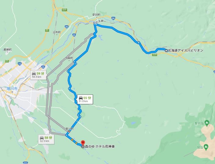 上川町のアイスパビリオンからは約1時間で到着