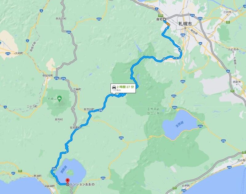 今回は札幌からの移動ということで、洞爺湖町にあるペンションおおのまでは約2時間30分(下道)