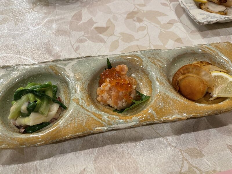 3種の小鉢は、サーモンの酒粕といくらがうまくてごはんとの相性もいい