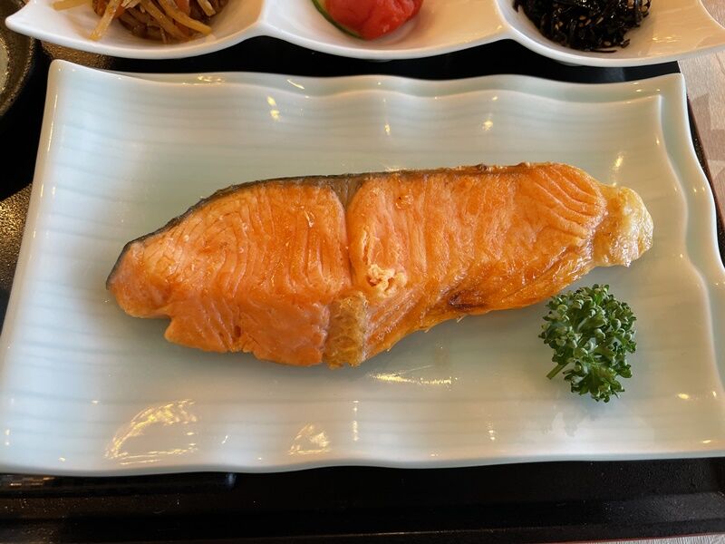 メインの鮭に、玉子焼き、きんぴら、明太子、昆布、うめぼし、納豆、のり
