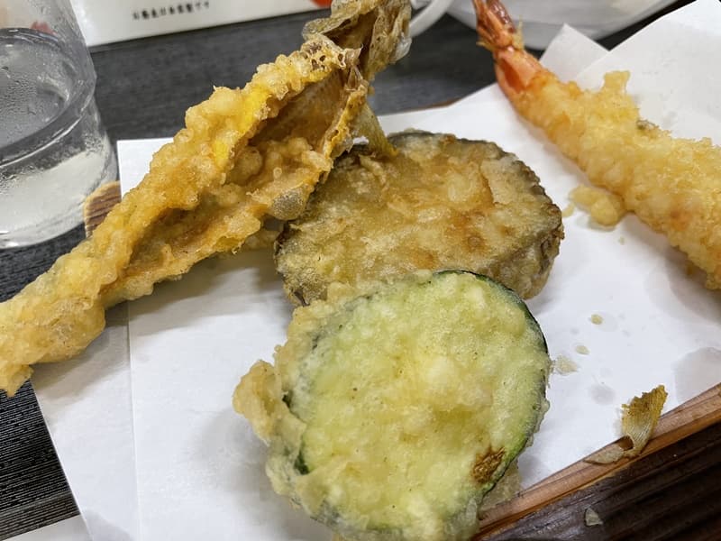 また、天ぷらはイワナと海老をはじめ、ししとう、かぼちゃ、ズッキーニ、ナス、サツマイモと豪華なラインナップ