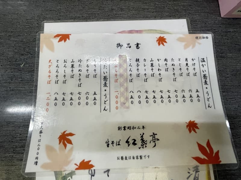定山渓「生蕎麦紅葉亭」のメニューと値段
