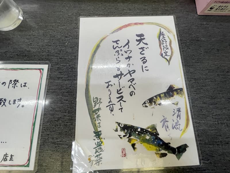 定山渓の「紅葉亭」で天ざる蕎麦を頼むとイワナの天ぷらが付いてきた