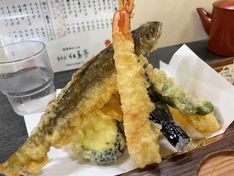 【定山渓の「紅葉亭」で天ざる蕎麦を頼むとイワナの天ぷらが付いてきた】
